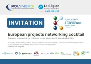 Join Us for a Networking Cocktail at K 2025! Polymeris, Auvergne Rhône-Alpes Entreprises and partners from AI-REDGIO 5.0, BE-UP, BIO-UPTAKE, CIRCPLASTX, PLASTICE, POLREC, POLYTRONICS, THERMOFIRE and ZEVRA projects will be present at K 2025. If you are attending the fair, we warmly invite you to our informal gathering and networking