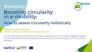 Zero emission electric vehicles enabled by harmonised circularity. The ZEvRA project improves the circularity of light-duty electric vehicles (EVs) throughout their entire value chain, from materials supply and manufacturing to end-of-life (EoL) processes. To do so, ZEvRA develops a Design for Circularity (DfC) methodology and a holistic circularity assessment aimed at improving the production of electric vehicles