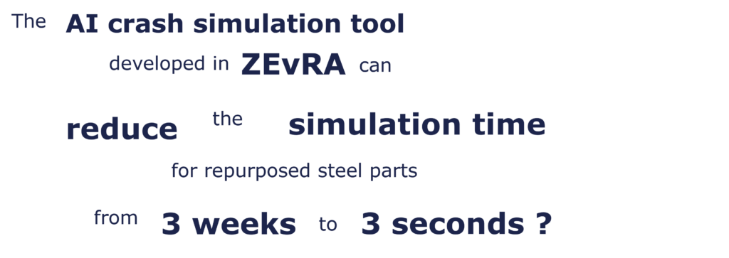 For steel repurposing, an AI tool is developed that allows the rapid assessment of a repurposed steel to determine whether it can be used for components that have pedestrian safety requirements. This can be done using conventional simulation, but with the newly developed tool, crash simulation time is reduced from six weeks to just seconds, enabling rapid redesign of repurposed components while maintaining safety requirements.