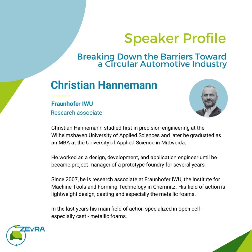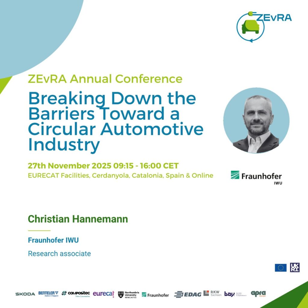 We’re thrilled to welcome Christian Hannemann from Fraunhofer IWU to the ZEvRA Annual Conference, happening on 27 November 2025 at Eurecat – Technology Centre in Cerdanyola, Catalonia (Spain) — with hybrid participation available.