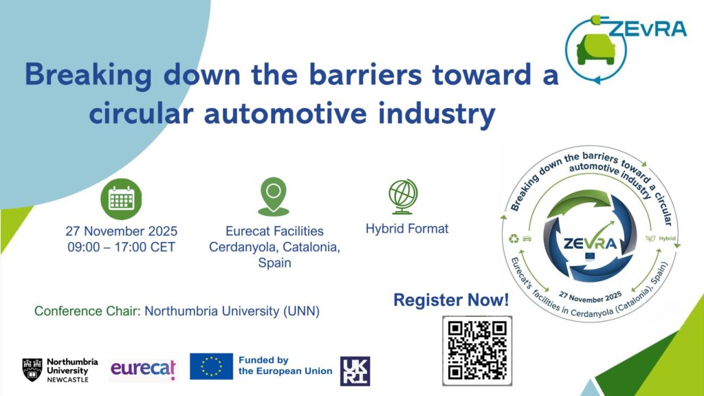 We’re excited to announce ZEvRA’s 1st Annual Conference, taking place on 27th November 2025 (09:00–17:00 CET) at Eurecat’s facilities in Cerdanyola, Catalonia, Spain — with hybrid participation available. This event will bring together leading stakeholders from across the automotive and mobility sectors to explore practical pathways toward circularity in electric vehicles. 👉 What to expect:✔ Keynotes, panels, […]